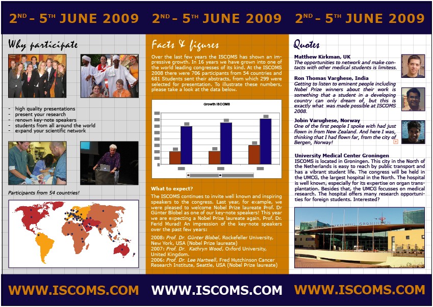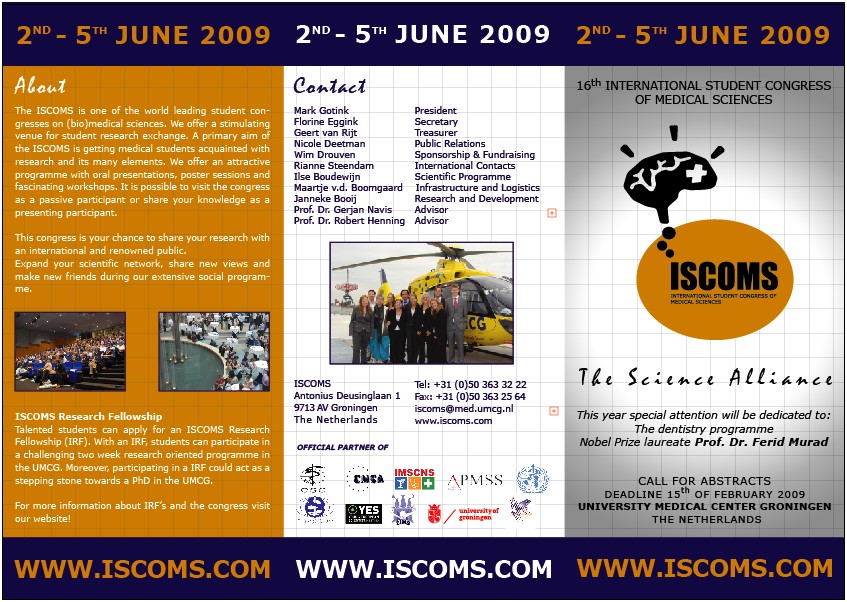 Imi face o deosebita placere sa va adresez invitatia de a participa la unul dintre cele mai renumite congrese medicale europene: INTERNATIONAL STUDENT CONGRESS OF MEDICAL SCIENCES - "The science alliance", ce va avea loc la Groningen - University Medical Center Groningen, Olanda, in perioada 2 - 5 Iunie 2009.